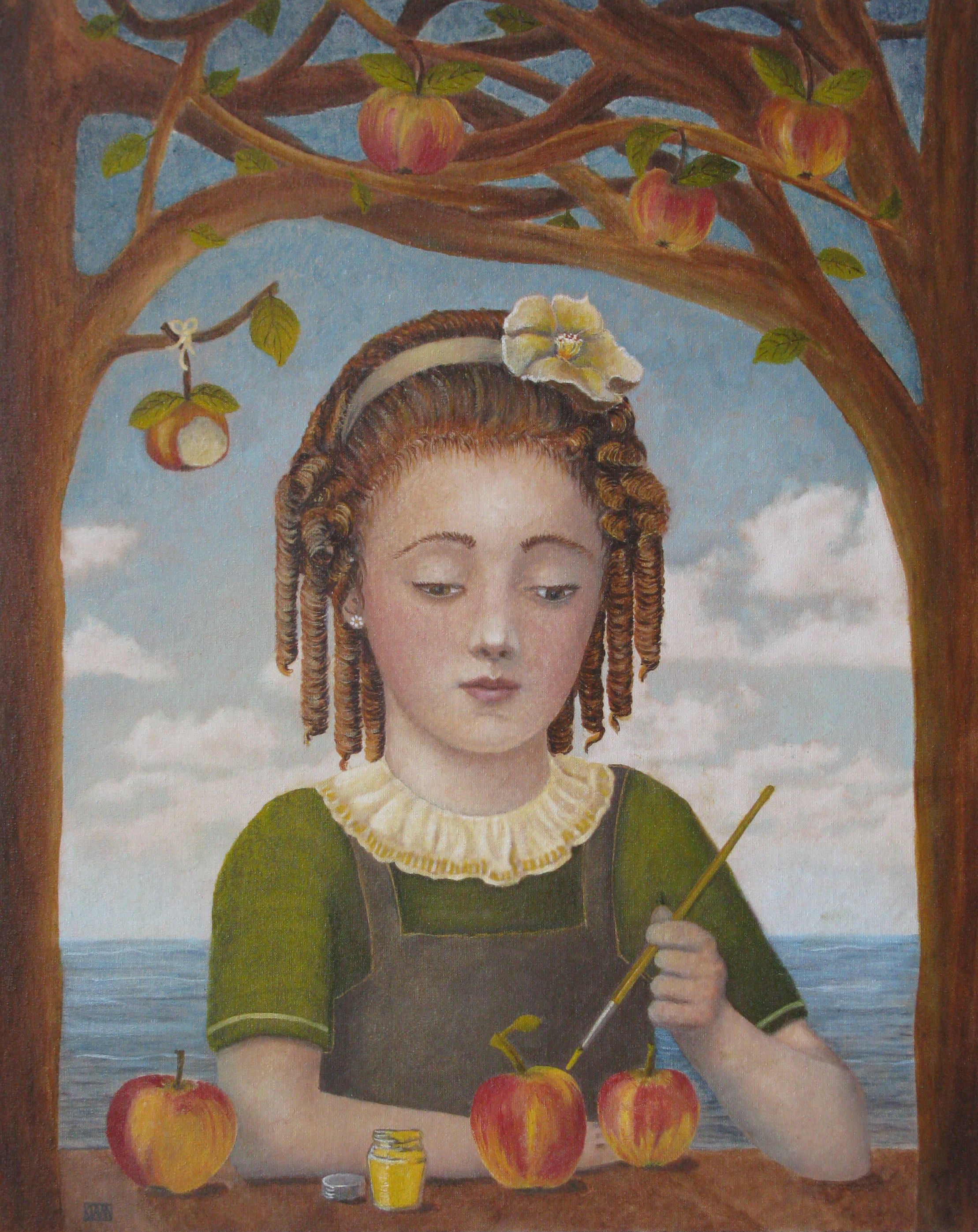 Like the curly-haired girl who touches up red apples with yellow paint with the sea in the background. The title of the painting was: 'because Eva didn't know exactly either'.